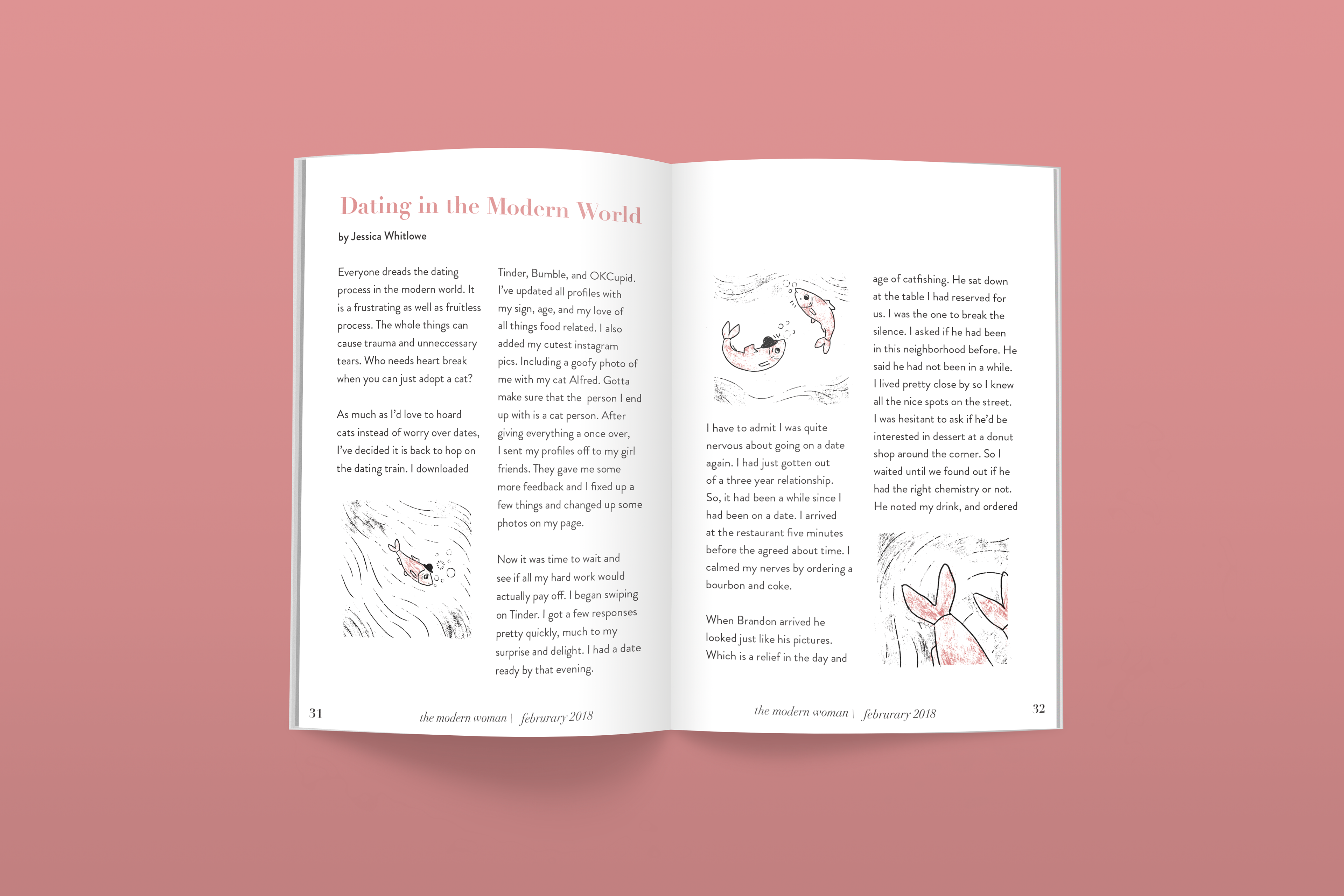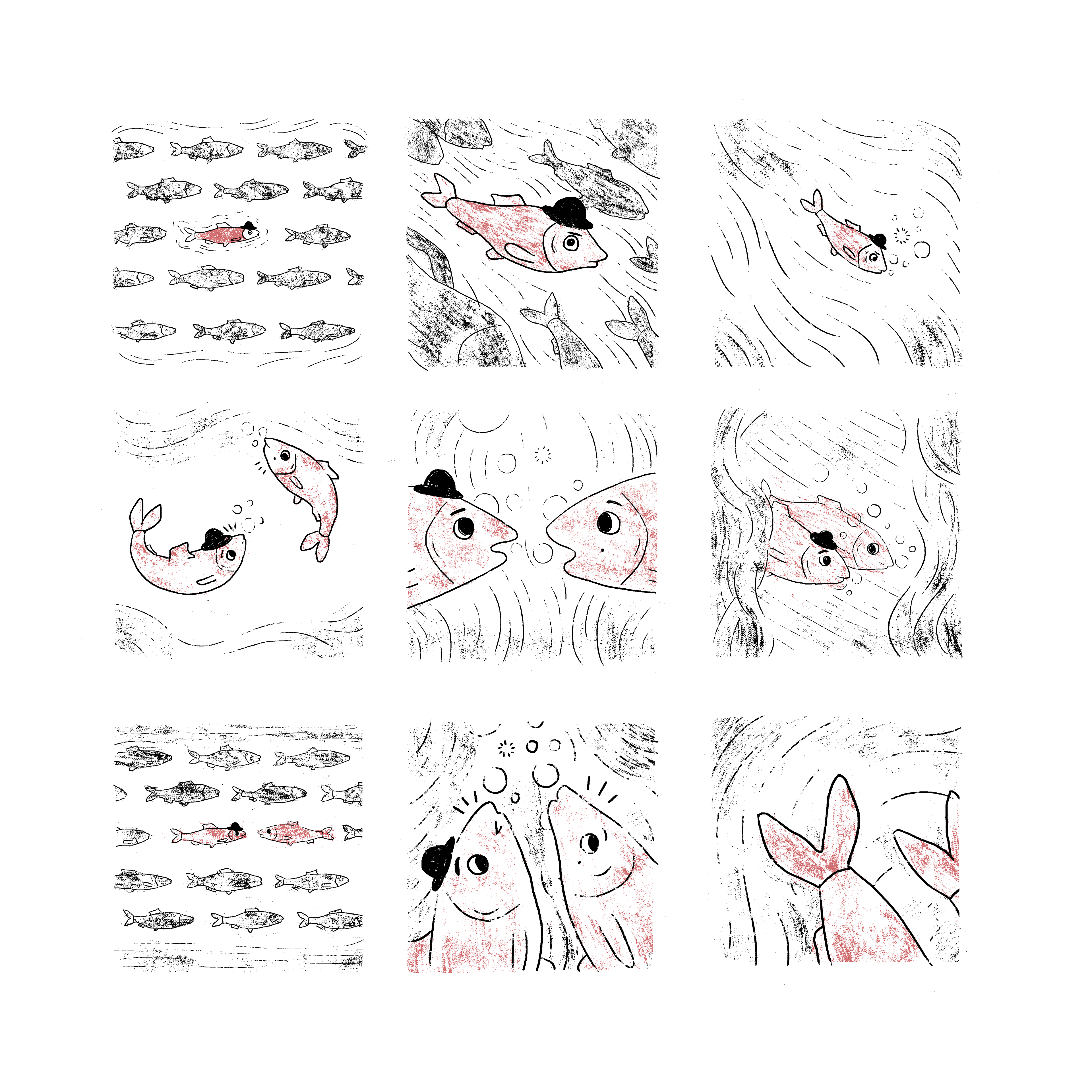 I drew multiple square spot illustrations. I created them digitally with textures and textured brushes in Photoshop.