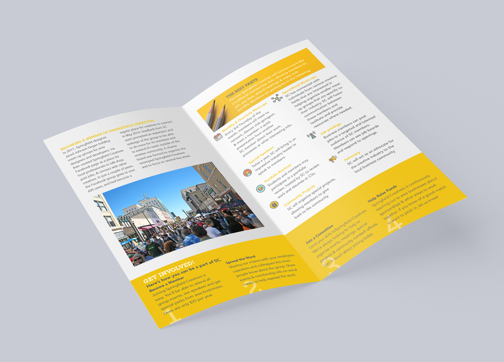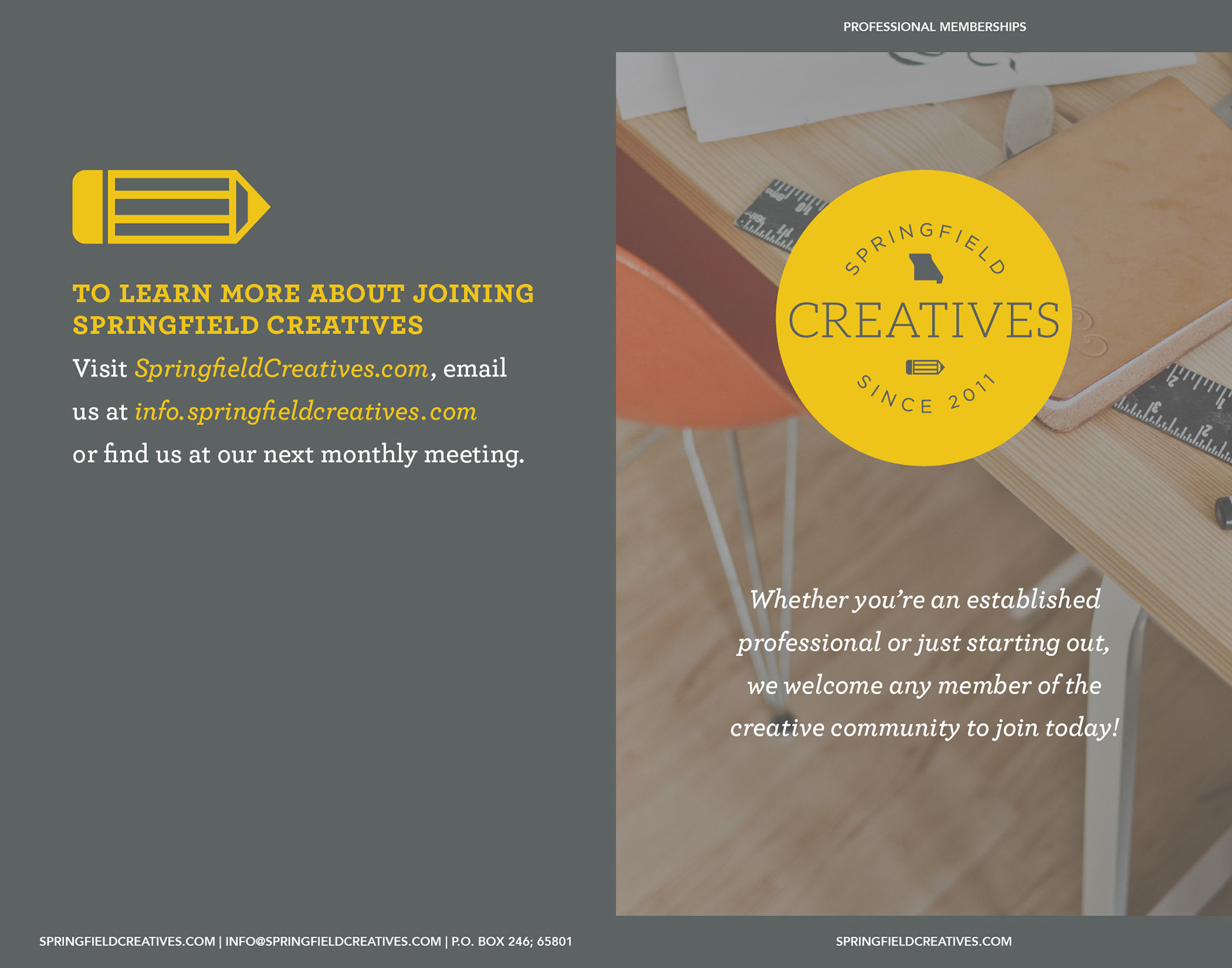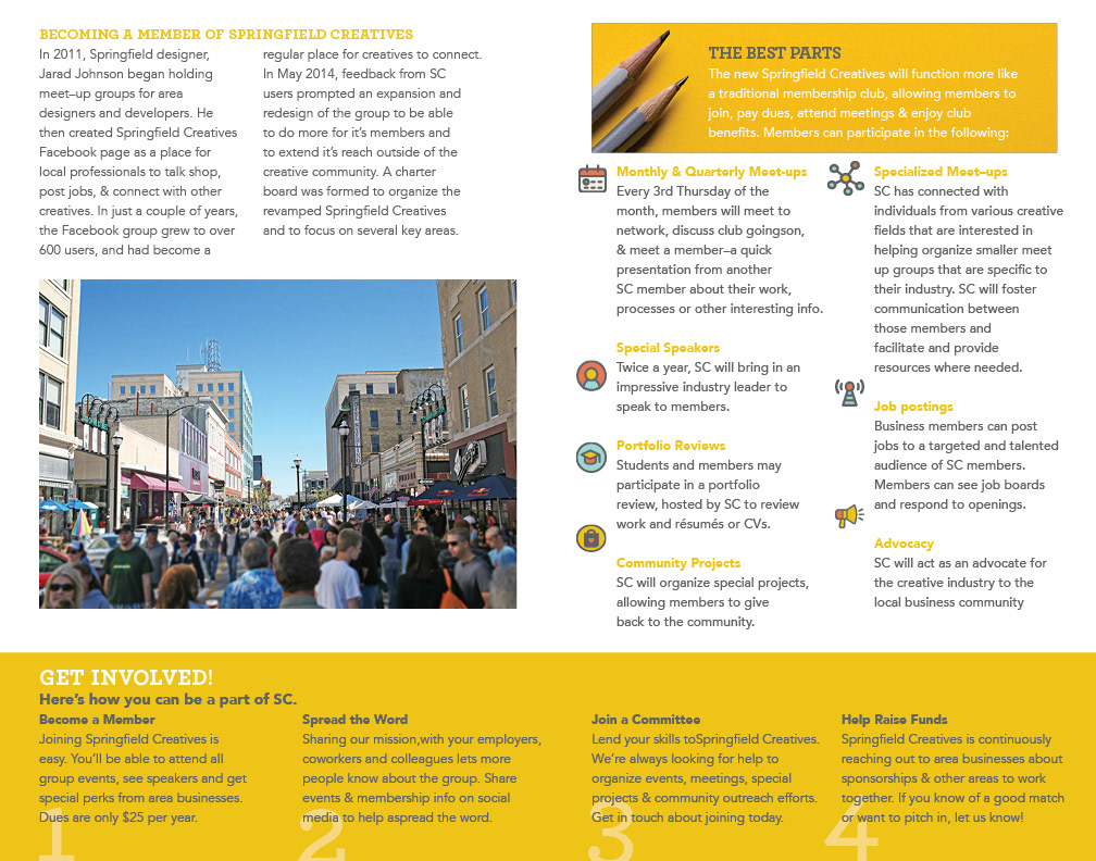 I worked with the President of Springfield Creatives to create this bi-fold. I made a version to target professionals in Springfield as well as students.
